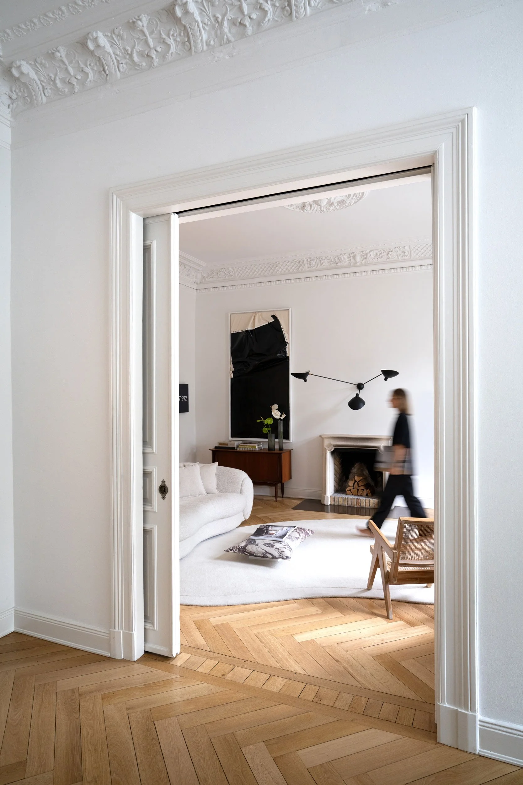 Historic elements such as stucco ceilings, herringbone parquet and a sandstone fireplace provide a richly layered backdrop with authentic patina. Rather than competing with this architectural character, the interior styling introduces calm through a restrained palette of light creams and warm beige tones. This reduction allows both art and objects to breathe.
